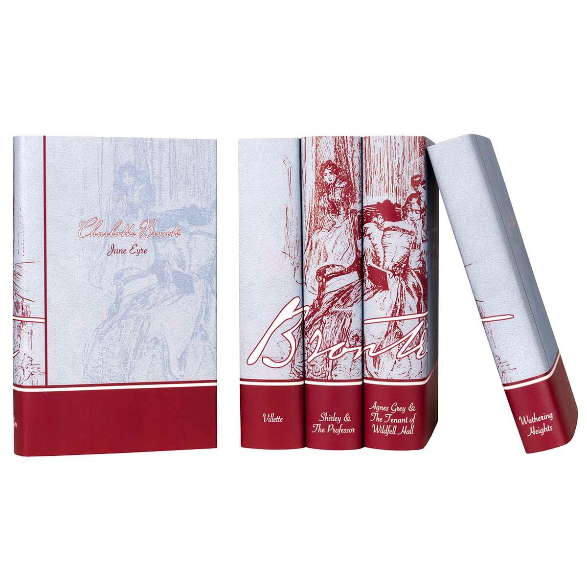 The Brontë Sisters custom collection immortalizes literary greatness with seven classic hardcover works from Everyman’s Library, each wrapped in a custom-printed jacket featuring a period illustration from an antique edition of Jane Eyre.