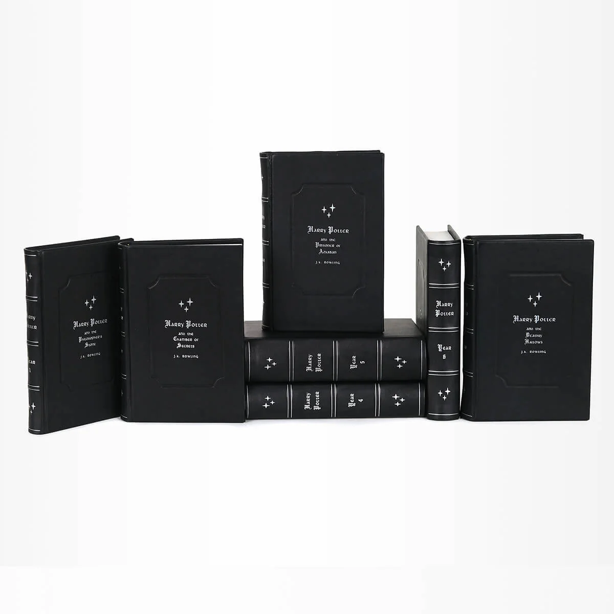 This set will be made to order for you. While we picture a classic black leather binding with silver foil details, the choice of leather color is yours! You can choose to represent your Harry Potter House color or a color to compliment your library best!