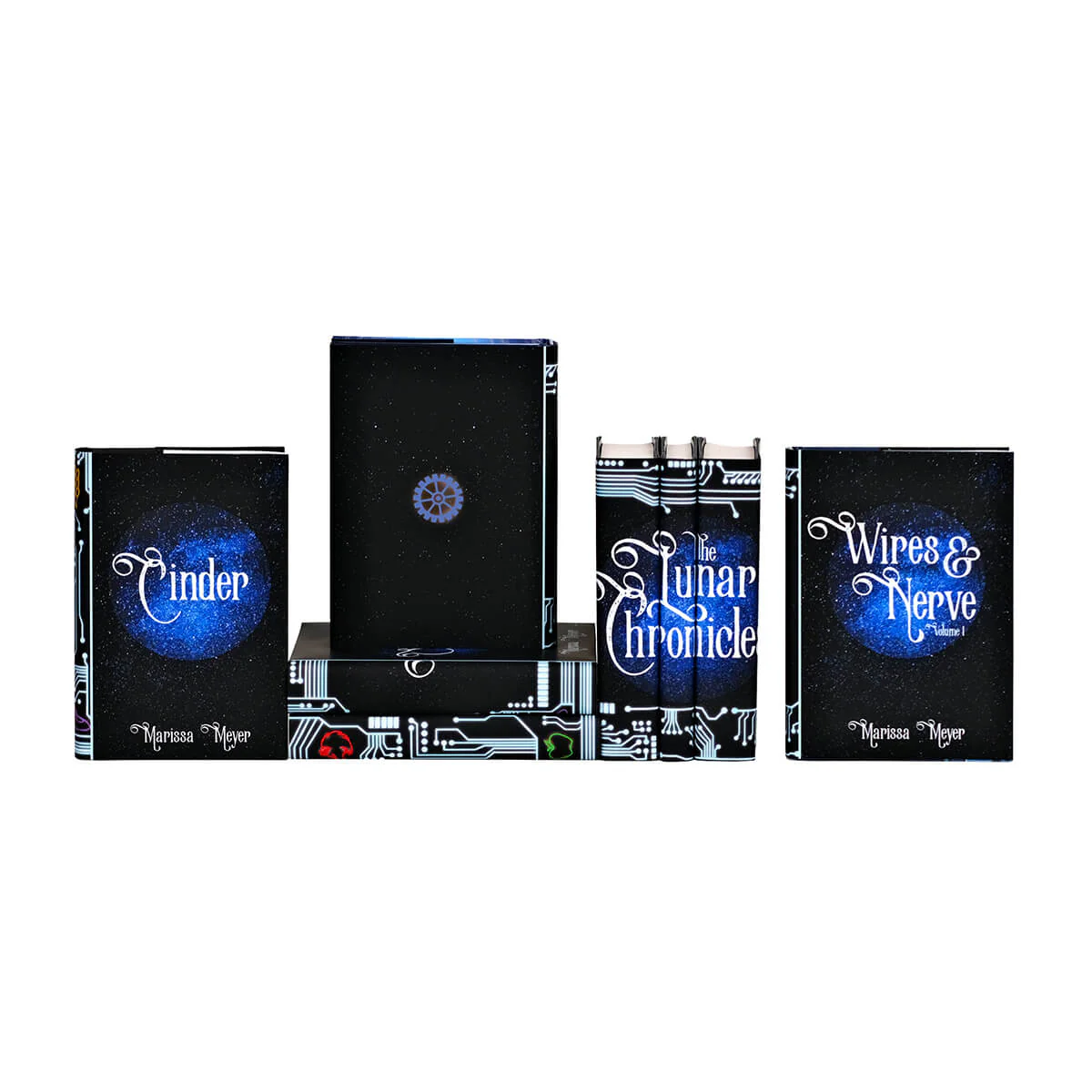 Sometimes, a popular series includes additional volumes and novellas written as tie-ins to the main story. This custom book set offers all 8 hardcover books wrapped in custom-printed dust jackets, including Wires & Never vol. 1 + 2 plus Stars Above, a collection of enchanting tales. It is a must-have for any fan of this dystopian series. Our designers created custom jackets that feature a galactic landscape and fit perfectly over the hardcover books.